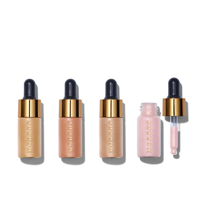 Ready, set, shine. This collection of four mini highlighter drops lets you choose how you wanna get lit. From a Flash of bronze to a Strobe of shimmering pink, there’s light in every drop. Use alone for a killer highlight or mix with your foundation for an illuminating boost.