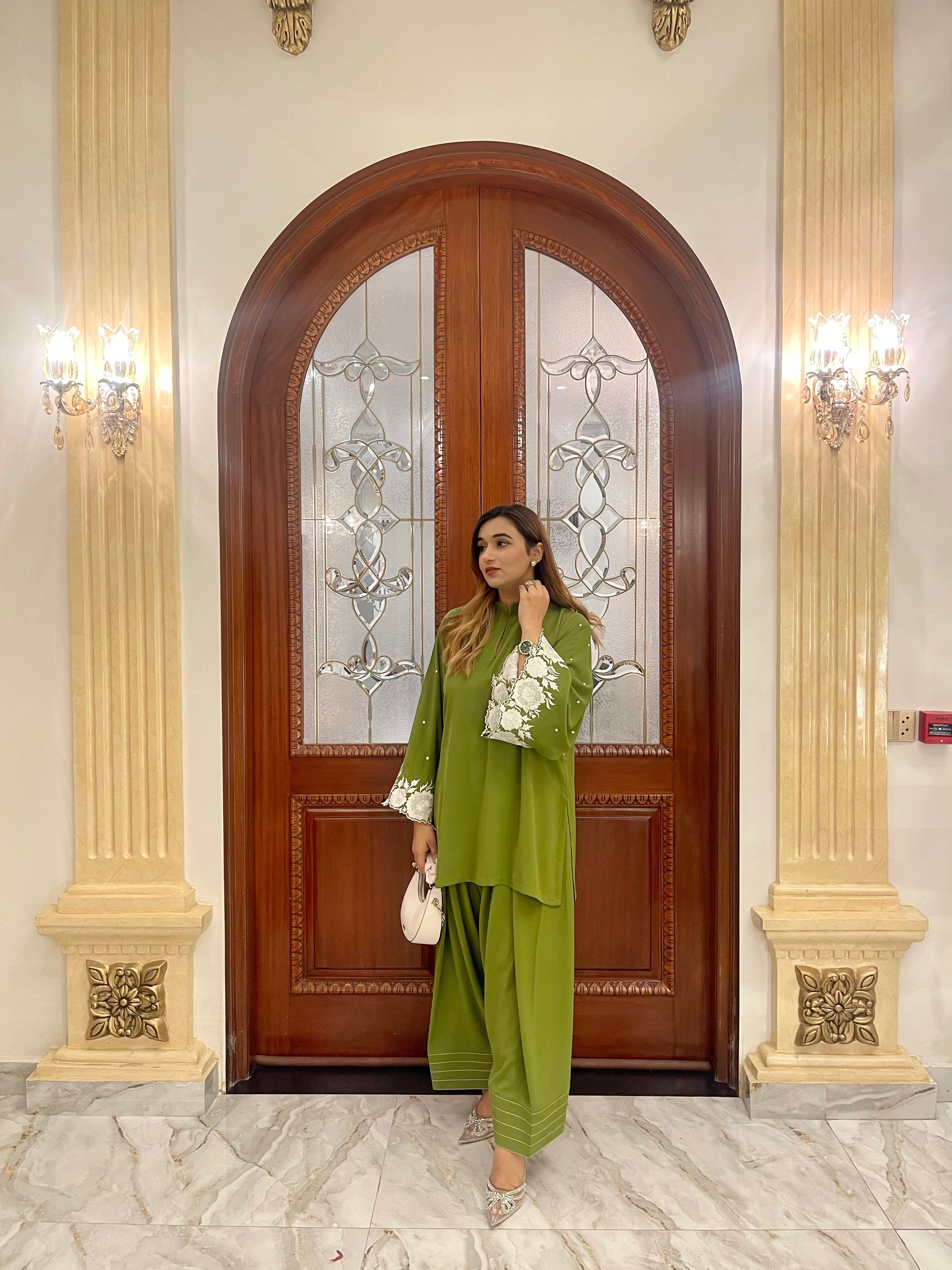Elevate your style with our exquisite moss green short shirt, beautifully adorned with intricate embroidery that showcases a stunning look. This captivating piece features a flattering silhouette that pairs perfectly with a traditional farshi shalwar, creating a harmonious blend of modern elegance and classic charm.