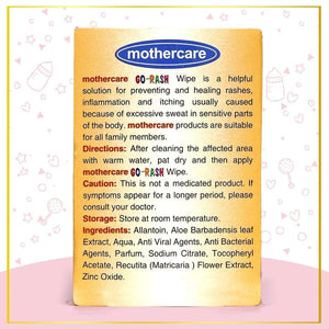 Mothercare GO RASH Wipes is a helpful solution for preventing and healing rashes, inflammation, and itching usually caused because of excessive sweat-insensitive parts of the body. Mothercare products are suitable for all family members.