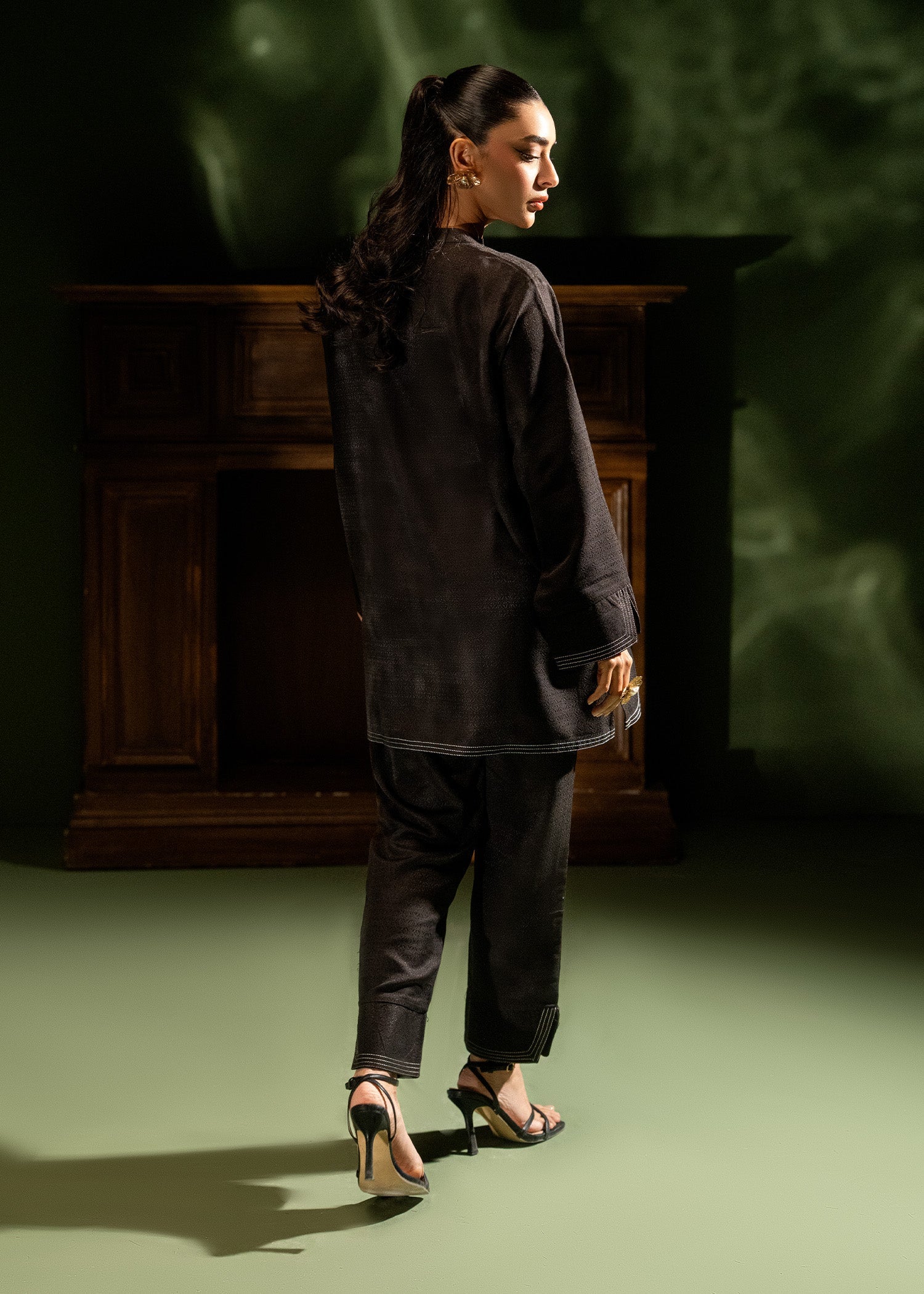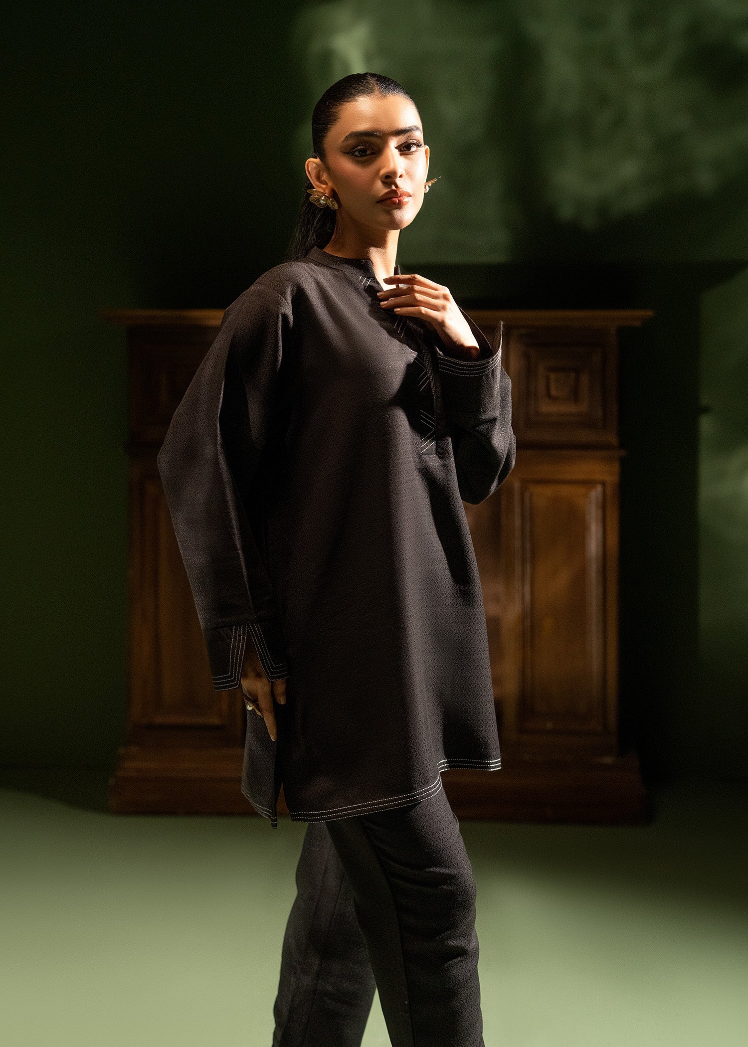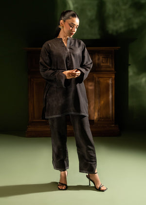 Command attention in this black co-ord set, featuring a sleek mandarin neckline and refined contrast stitching along the hems and cuffs. This modern take on traditional wear blends a minimalist aesthetic with subtle intricate detailing, making it a versatile staple for any formal wardrobe