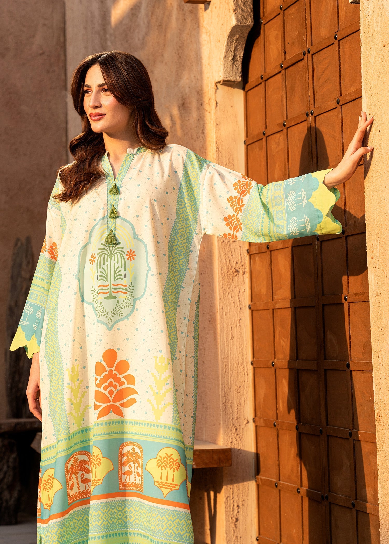 Radiate freshness in this ivory floor-length kaftan, adorned with vibrant mint and orange botanical prints and an ornate central medallion. Its flowing silhouette and delicate tassel detailing offer a breezy, sophisticated look perfect for warm-weather celebrations.