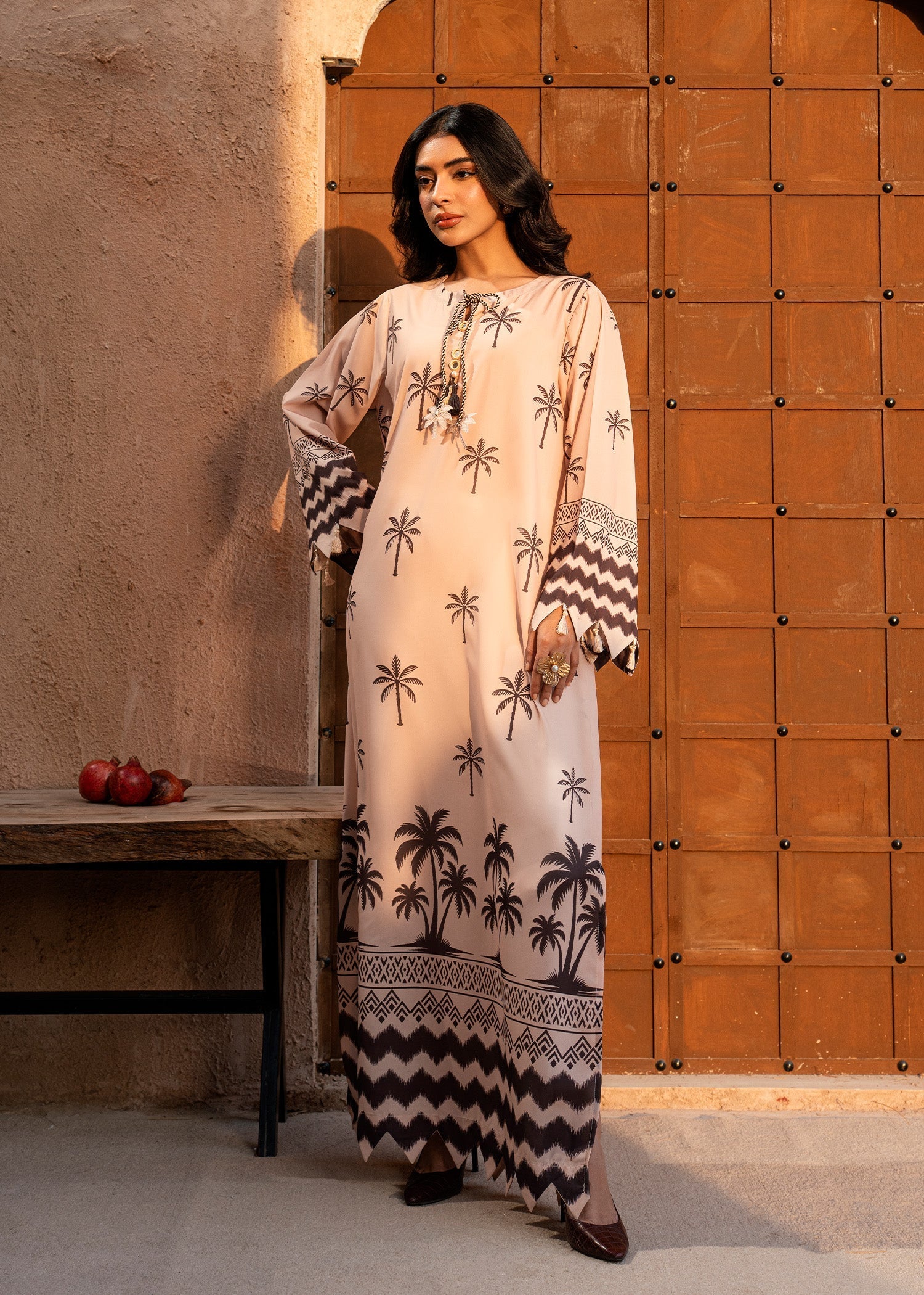 This graceful, peach-toned floor-length dress features a striking palm tree motif and geometric chevron borders for a touch of tropical sophistication. Designed with flowing sleeves and a relaxed fit, it offers a timeless aesthetic perfect for golden hour gatherings or resort wear