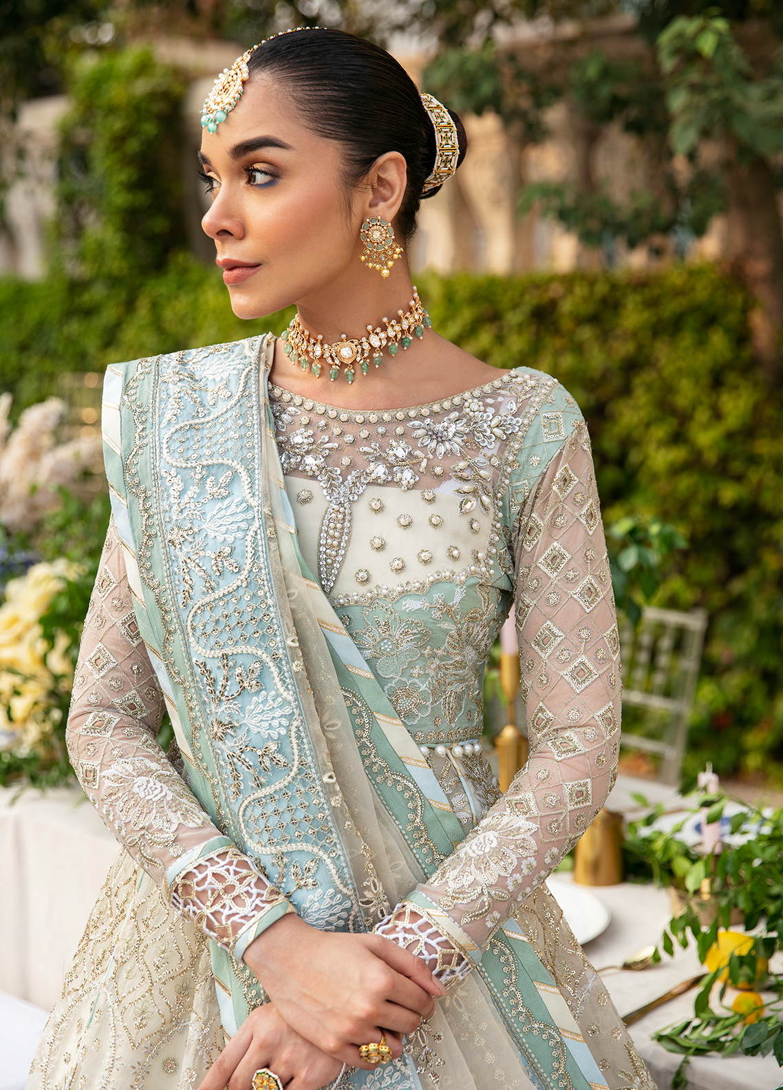- Twin-sequinned & embroidered ice blue organza border for dupatta