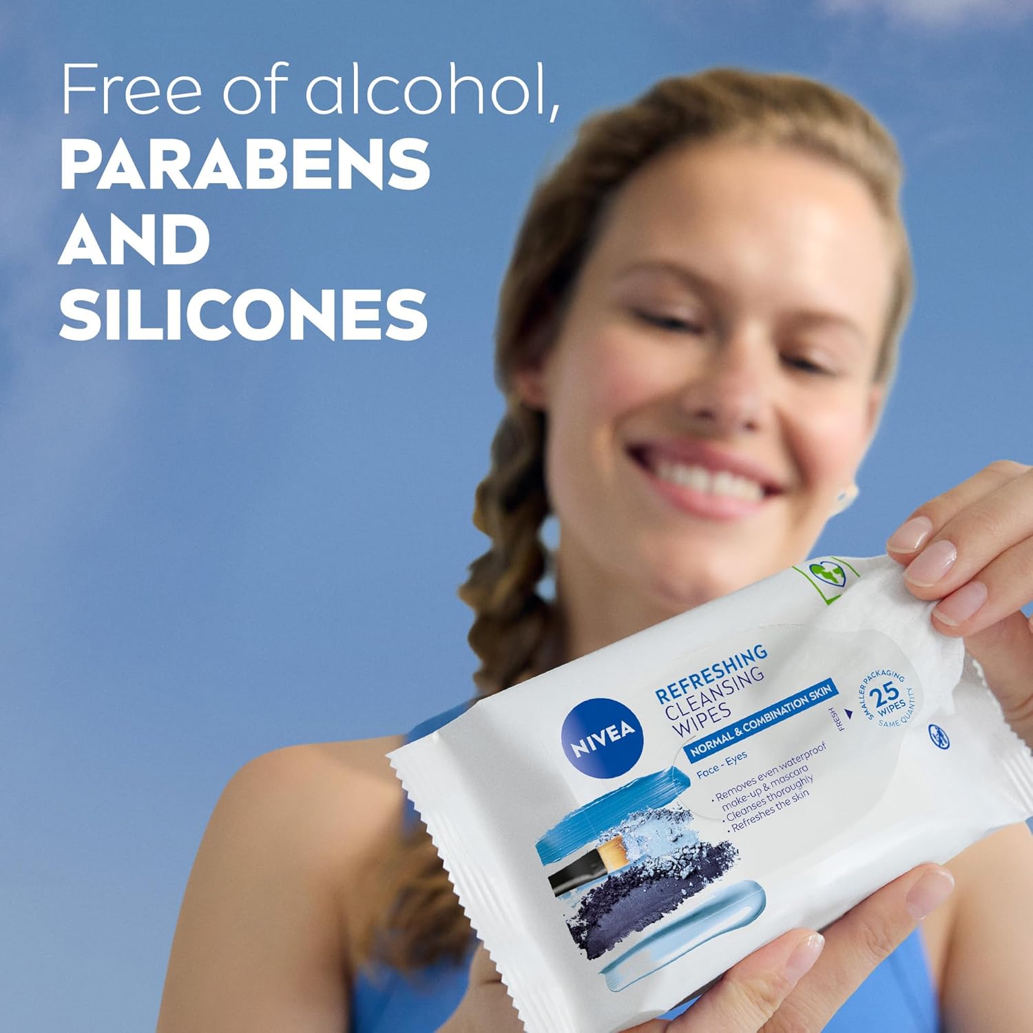Thanks to the SkinGentle Complex with Pro-Vitamin B5 & Hydramine, the plant-based wipes are mild to the skin and protect its moisture balance. They effectively and gently remove even waterproof makeup & mascara leaving your skin hydrated & refreshed: NIVEA 3 in 1 Refreshing Cleansing Wipes.