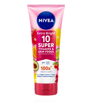 Nivea Body Serum Extra Bright 10 Super Vitamins & Skin Foods (180ml) is a lightweight, fast-absorbing serum designed to deeply repair and brighten skin in 5-7 days. It features a concentrated formula with 150x Vitamin C, Vitamin A, Niacinamide, and skin foods (Lemon, Pomegranate, Avocado) to reduce dark spots, nourish, and provide SPF 15 protection for radiant, youthful, and firm skin.
