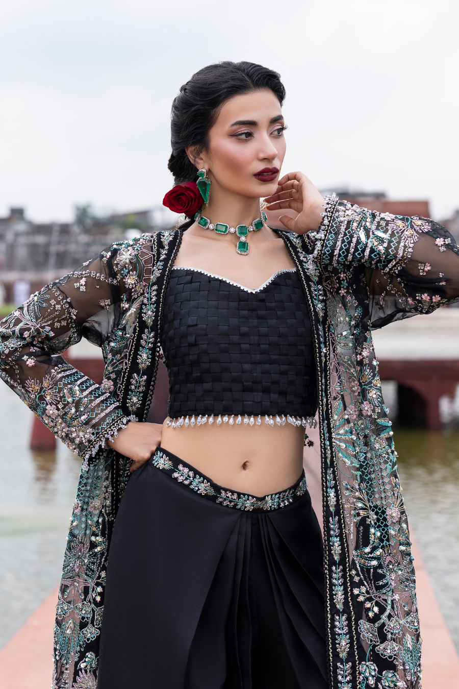 Dark, divine, and endlessly sophisticated Noir from the Ember Collection is the ultimate expression of timeless allure. Crafted on a sheer black organza base, the long shirt features meticulously hand-embellished panels and sleeves, adorned with intricate threadwork, sequins, and refined craftsmanship that glimmer with understated elegance. The look is completed with a digitally printed and embroidered organza dupatta bordered on all four sides and paired with a sleek raw silk trouser for a polished finish. Noir captures the perfect balance of grace and grandeur, an ensemble made to turn every occasion into a statement of style.