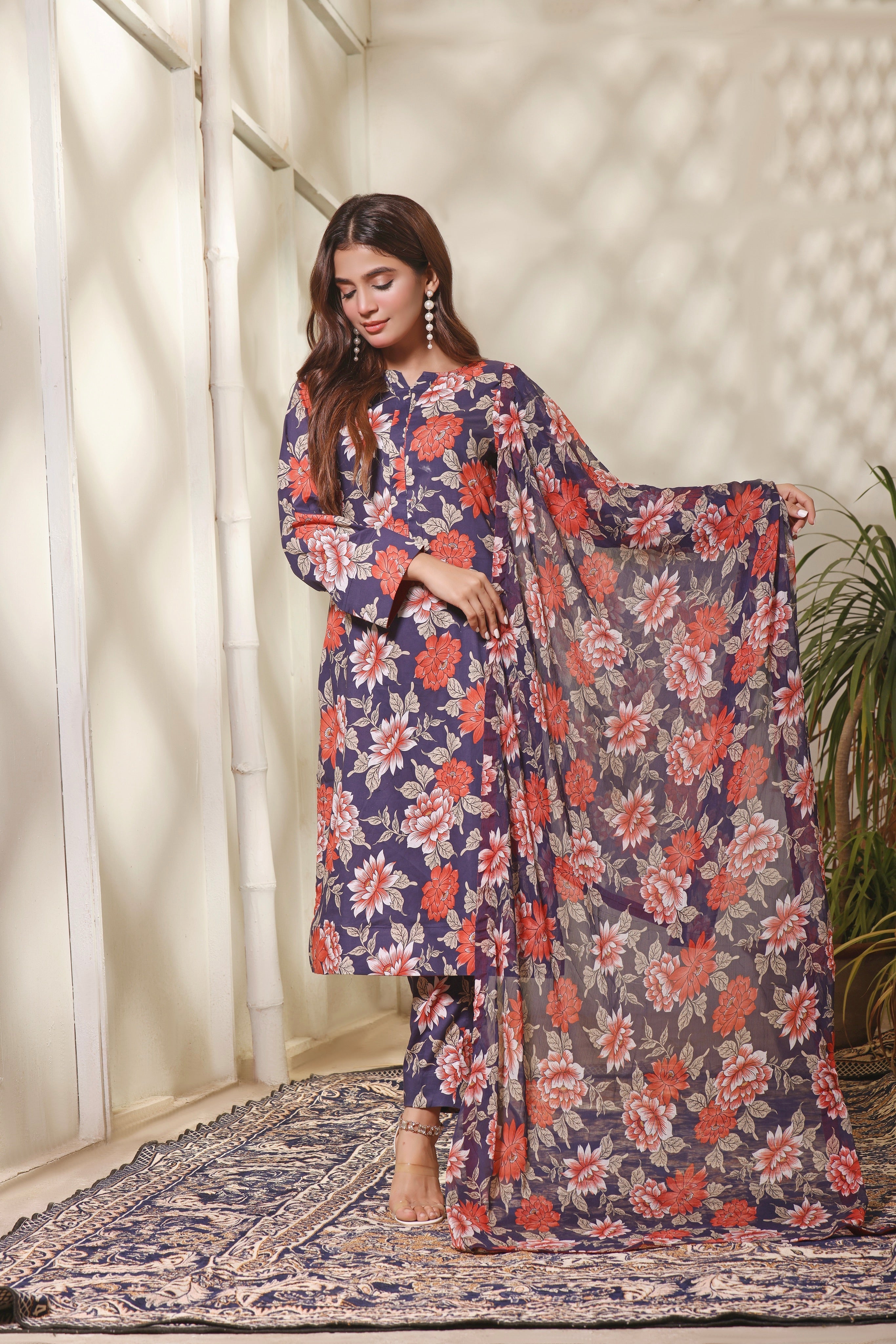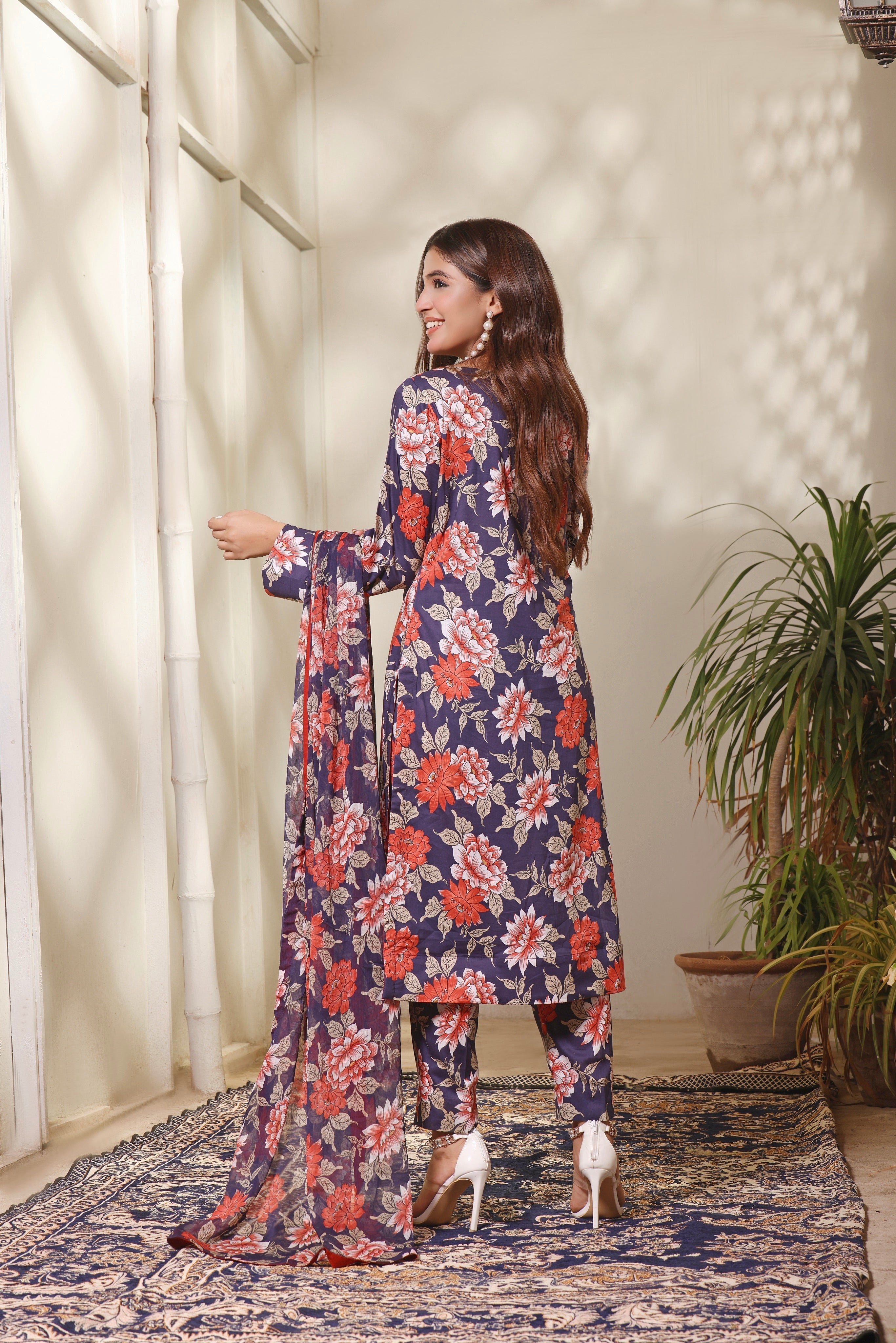 Experience ExquisitelyThis suit is for a new goes this summer seasonThe article includes:Unstitched 3PCDigital Printed Shirt 3 yardsDigital Printed Chiffon Dupatta Digital Printed Trouser 2.5 yards