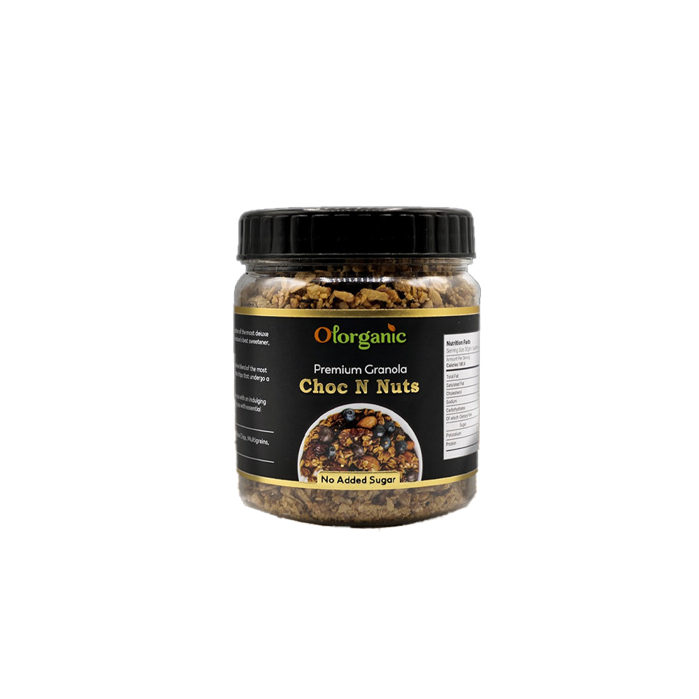 Olorganic Granola Choc N Nuts has dried fruits, nuts and chocolate with honey. It has premium quality dried fruits and chocolate chips.