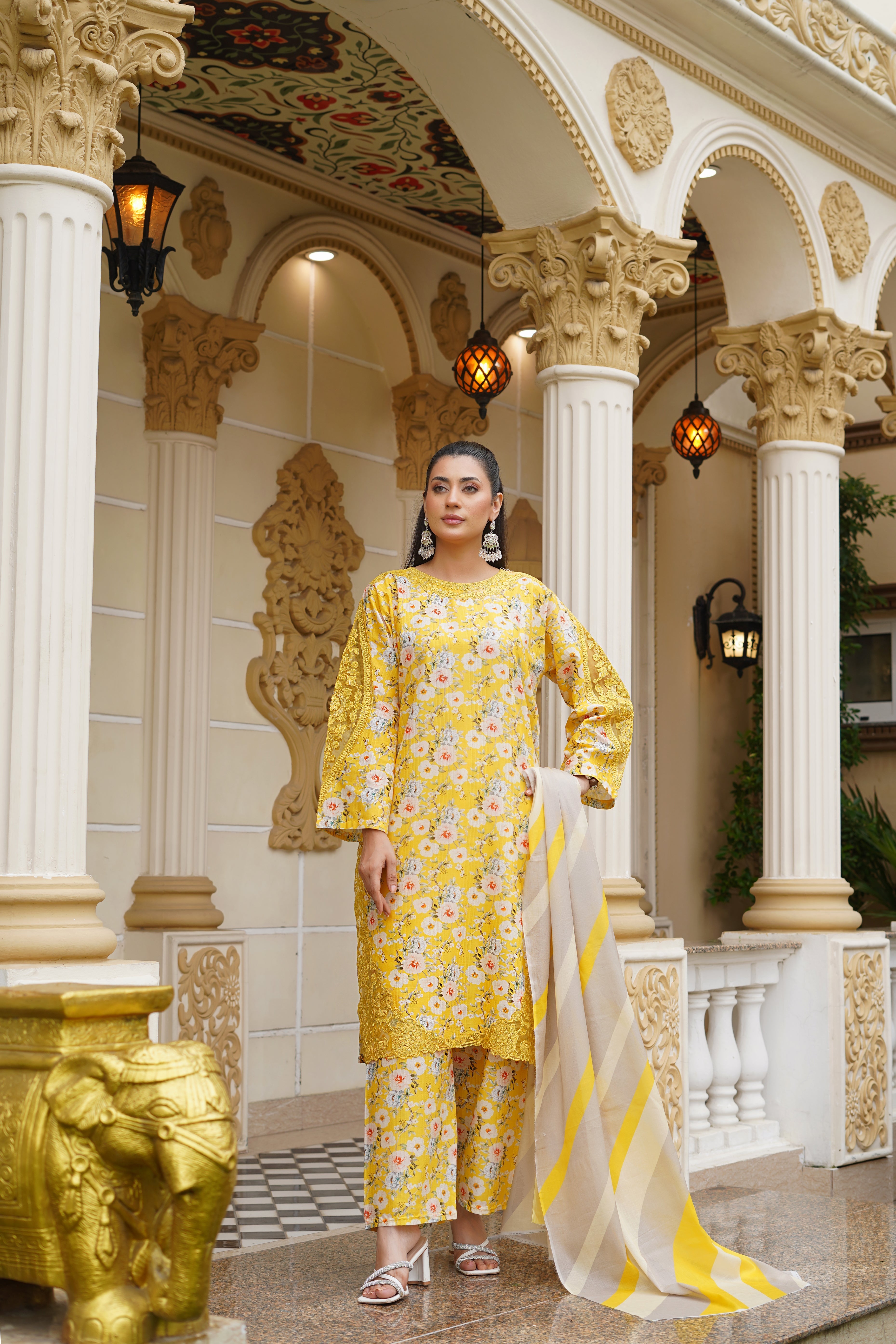 This exquisite festive/party wear kurta set exudes elegance in deep purple. The straight cut kurta features intricate embroidery, while the cotton shalwar adds a traditional touch. Complete with a matching dupatta in lawn fabric, this 3-piece ensemble is perfect for all seasons. Lining attached for convenience. Brand: Gulposh By Kkt.