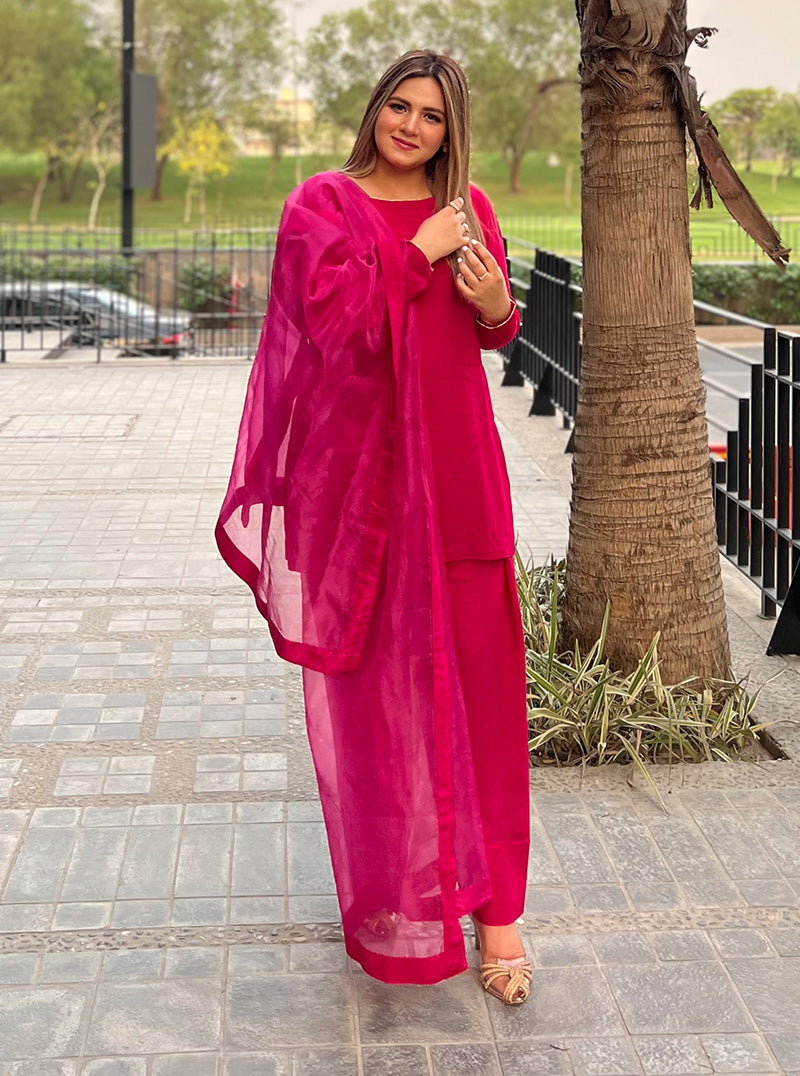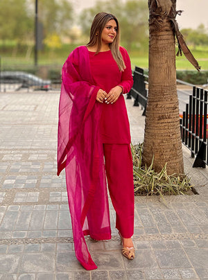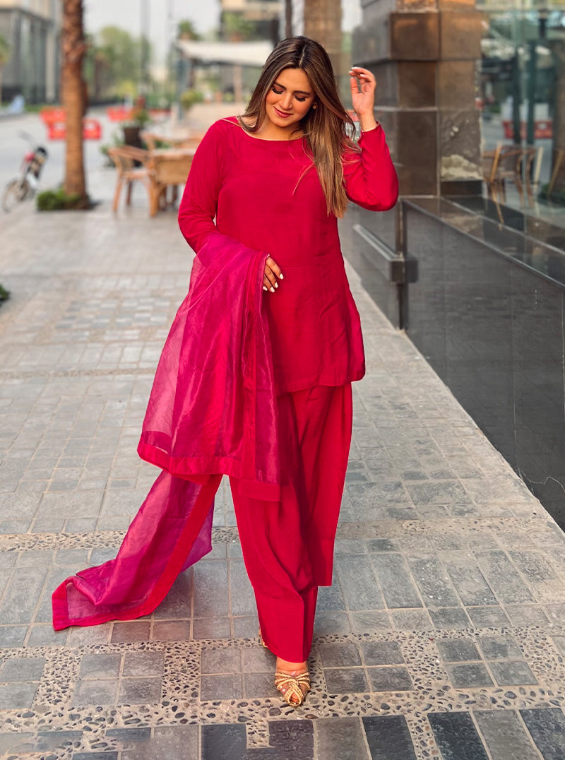 Paired with a graceful 3-yard Organza Dupatta, this outfit offers versatility with optional sleeves, allowing you to personalize your style. More than just clothing, it's a bold statement of fearless elegance, inviting you to embrace the vibrant spirit of "Ruby" and leave a lasting impression wherever you go.