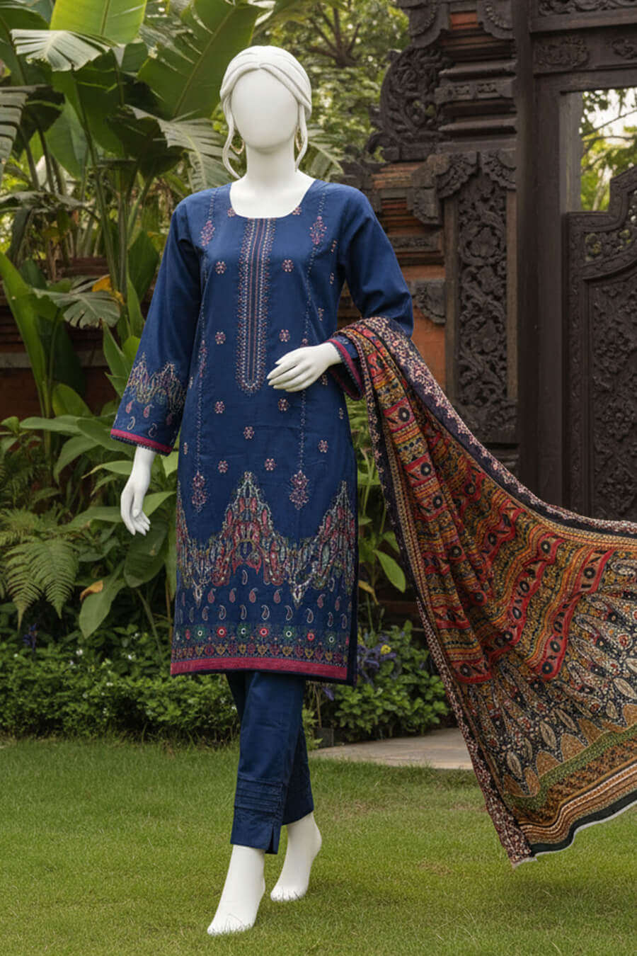 Digital Printed Embroidered Shirt • Digital Printed Cutwork Dupatta • Airjet Dyed Trouser