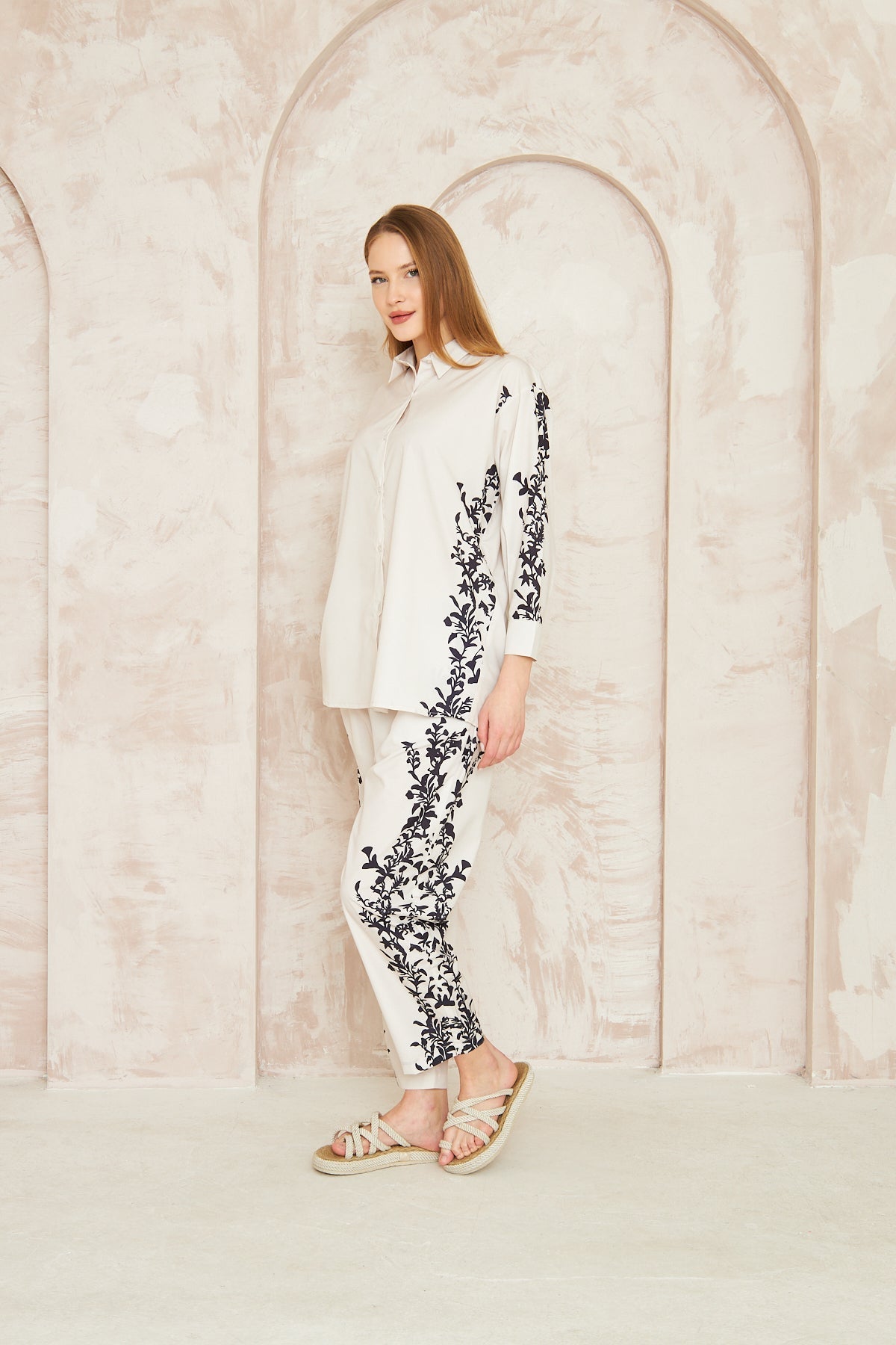 The radiant ensemble offers a unique and stylish look for any special occasion. This 2-piece suit features a chic contemporary short shirt with minimal floral prints. The matching trousers make it a trendy outfit to style at fun gatherings.