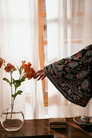 Embrace timeless sophistication with this stunning three-piece ensemble, crafted in luxurious black raw silk. The shirt features intricate multi-color sequin embroidery, adding a touch of opulence and artistry to your look. Paired with perfectly tailored black raw silk trousers, enhanced with elegant trouser borders, this outfit offers both comfort and refinement. The finishing touch is a graceful black chiffon dupatta, featuring delicately embroidered borders and an artfully detailed pallu.