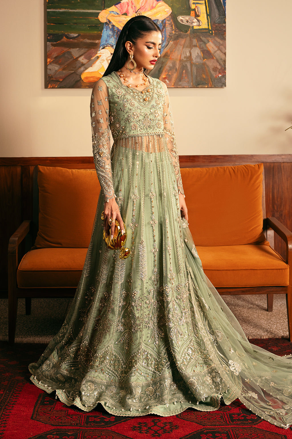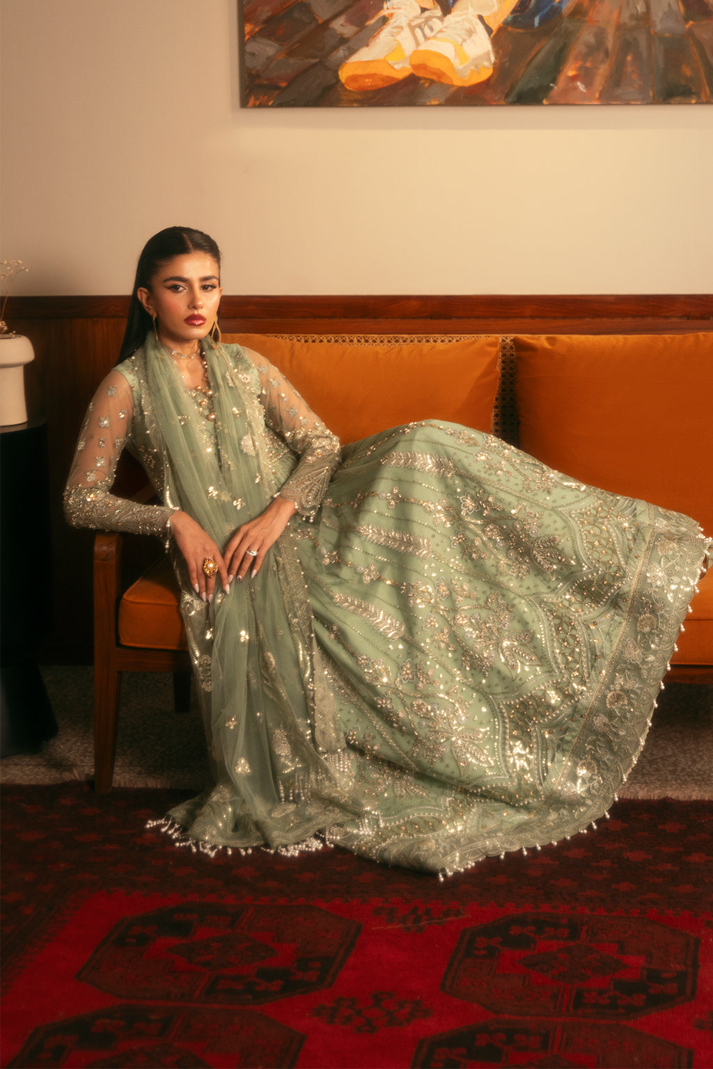 A graceful sage green maxi crafted with meticulous attention to detail, featuring stunning hand embellishments on the front bodice and flowing kalis. The design radiates elegance and charm, while the accompanying sequin-encrusted dupatta adds a touch of sparkle and sophistication. Perfect for formal occasions and festive events, this ensemble combines timeless beauty with contemporary allure.