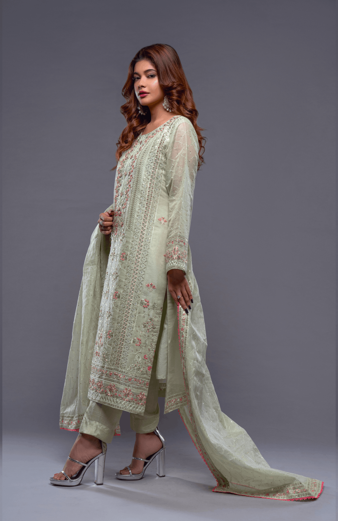 Sparkle your way through the crowd in this delicate and radiant ensemble, featuring head to toe resham and sequin-work on shirt and dupatta.