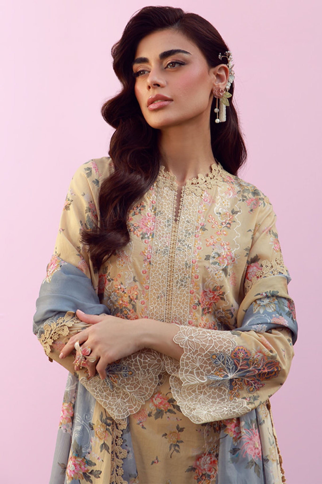 Delicate, graceful, and effortlessly refined, this butter yellow and grey contrasting ensemble captures the essence of modern femininity. It is adorned with intricate floral print and embroidery in gentle hues, enhanced by a finely detailed lace panel along the neckline and borders. Subtle craftsmanship and airy textures create a look that feels both luxurious and light.