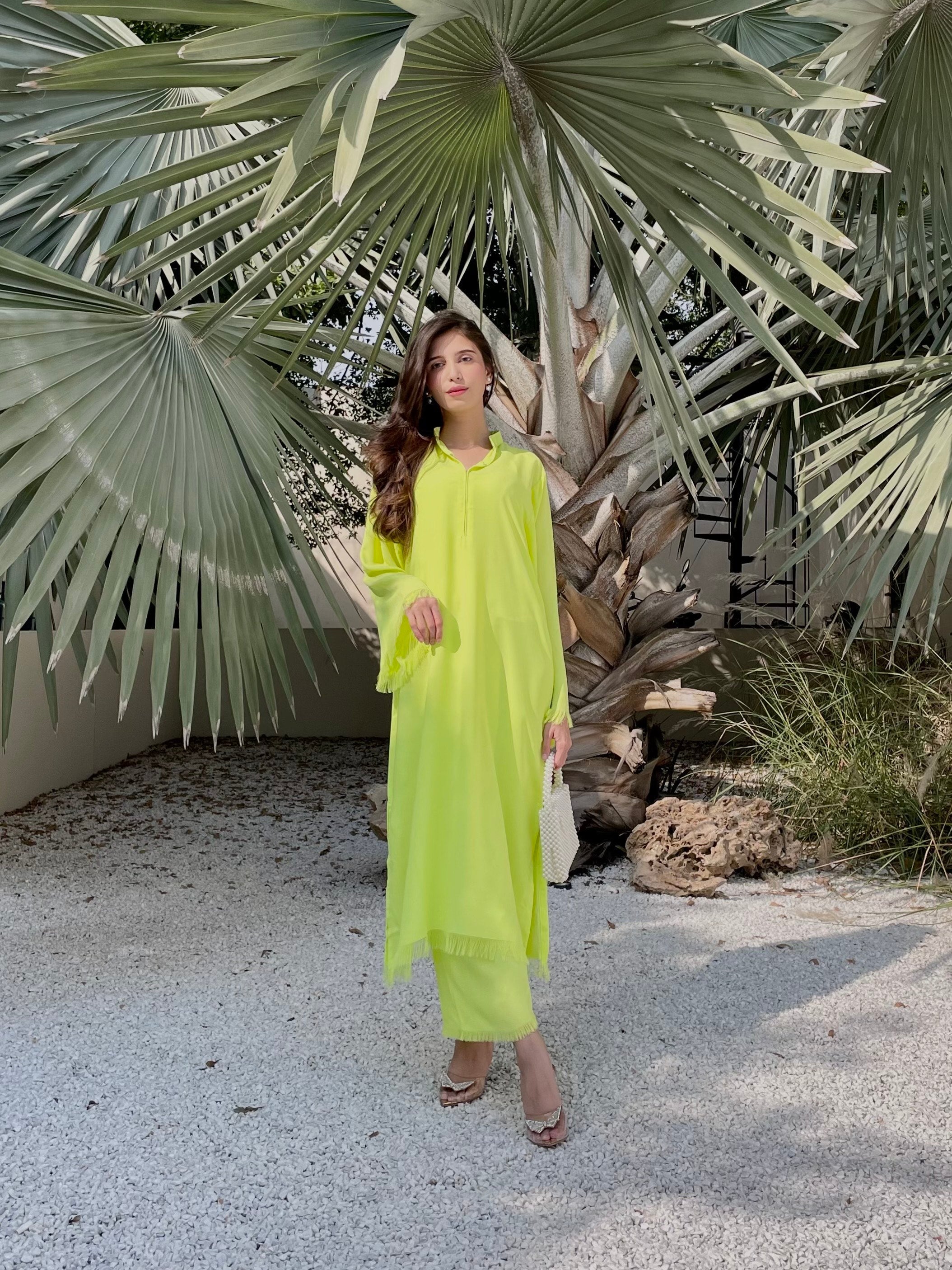 Presenting our supper hot Neon Colour Long Elegant Shirt, a timeless addition to your wardrobe. This shirt exudes understated sophistication with its classic design and versatile neon green yellow shade. Tailored for a graceful silhouette, it offers a perfect blend of comfort and style with threaded Hand Work on shirt ,sleeves and trouser.This long shirt and Cullotes effortlessly transitions from day to night. Elevate your fashion with this wardrobe staple that embodies elegance in every detail.