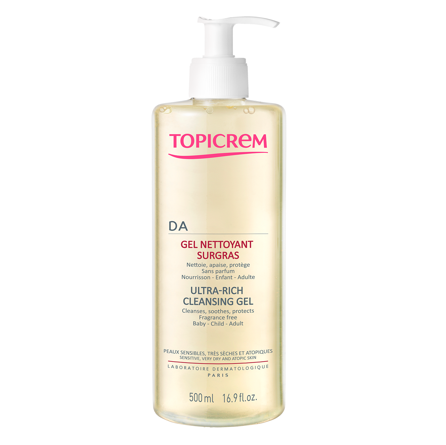 Topicrem DA Ultra-Rich Cleansing Gel is a soap-free body cleanser specifically developed to relieve dryness, hypersensitivity, and atopic skin. It is suitable for babies, children, and adults. It features flaxseed oil, glycerin, and allantoin, which restore the hydrolipidic film and support the healing process. Thus, the skin barrier will remain comfortable and soft to the touch throughout the cleansing process, minimizing friction-induced irritation.