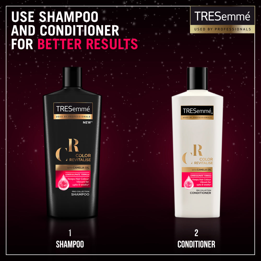 Tresemme Shampoo Colour Revitalize - 170ML is a colour-protecting solution that revitalises and promotes vibrant, long-lasting colour. This advanced shampoo helps to reduce colour fading by up to 80%, whilst adding shine to hair. It is enriched with green tea extract and sunflower seed oil to leave hair healthy-looking and protected.