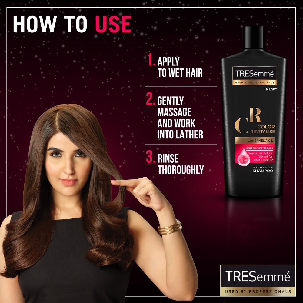 Tresemme Shampoo Colour Revitalize - 360ML is a colour-protecting solution that revitalises and promotes vibrant, long-lasting colour. This advanced shampoo helps to reduce colour fading by up to 80%, whilst adding shine to hair. It is enriched with green tea extract and sunflower seed oil to leave hair healthy-looking and protected.