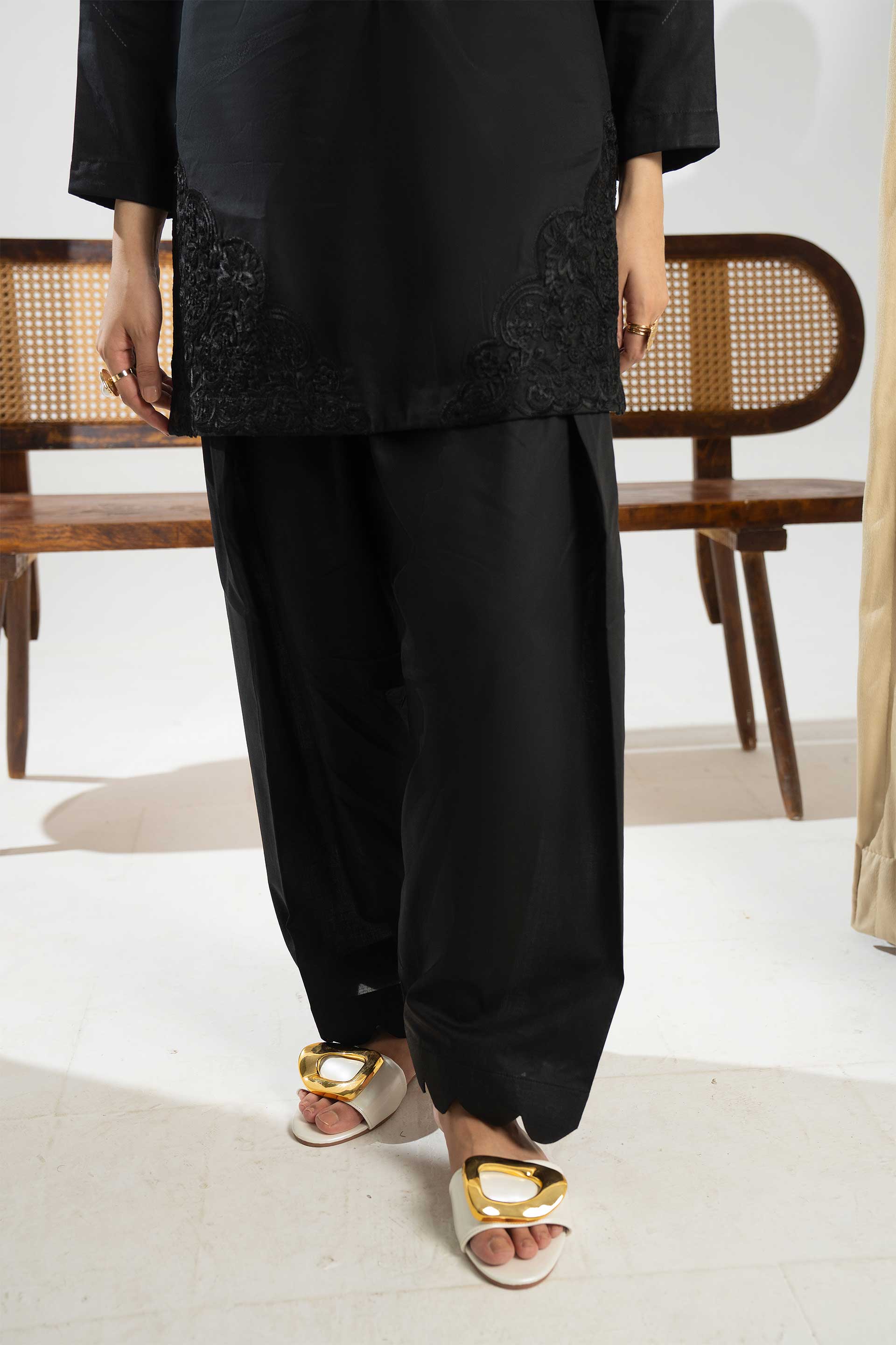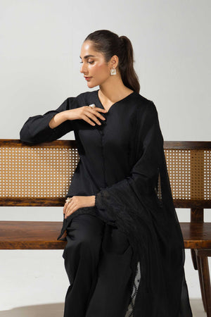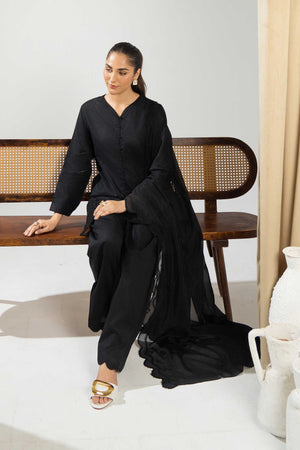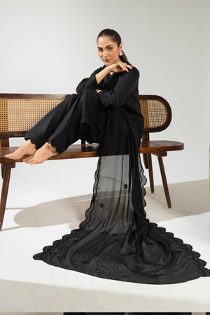 The Vanta suit offers a refined black ensemble perfect for both formal and semi-formal settings. Available as a 2-piece or 3-piece set, it includes a finely embroidered lawn shirt paired with understated plain trousers. The beautifully embroidered net dupatta enhances the look with subtle elegance, making this suit an exquisite choice for those seeking timeless style and graceful comfort.
