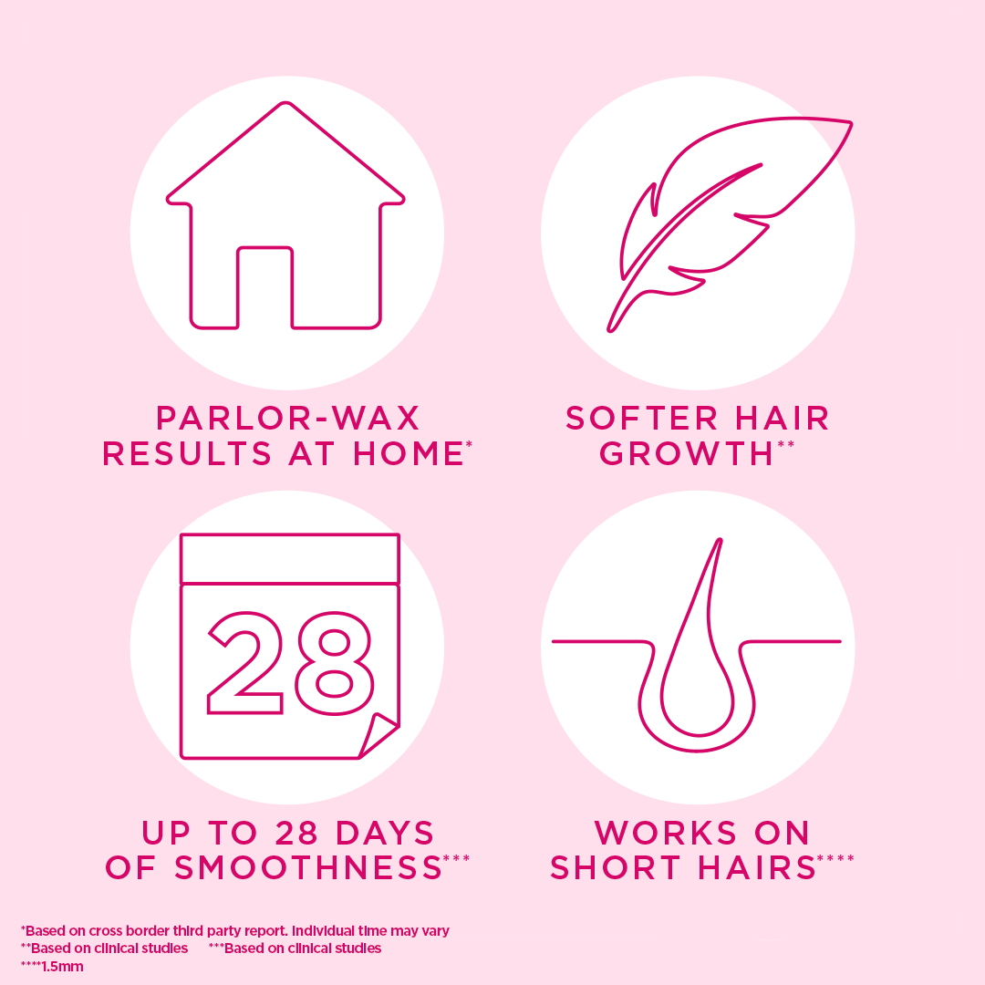 • Retain outer pack • Read and follow all precautions and directions before use. • Suitable for use on the legs, arms, underarms and bikini line. • NOT SUITABLE for use on head, face, eyes, nose, ears, around the anus, genitals and nipples or any other body parts. • Do not use on varicose veins, scars, moles, spotty, broken, irritated, sunburnt skin or on skin that has had an adverse reaction to waxes in the past. Always leave 72 hours between hair removal sessions. • Check with your doctor before using if you are on any medication which can affect the skin or if you suffer from any skin related disorder. • Waxing is not suitable for the elderly, diabetics or people taking oral retinoids. • If you have not waxed before we recommend starting by removing hair from the legs. Only when you have experience then progress to the sensitive areas of underarm and bikini line. • Before use, make sure your skin is dry, non-irritated, and free of creams, oils or deodorant. • Before every use, TEST YOUR SKIN REACTION by applying and removing the product to a small part of the area you wish to treat, following the directions for use. If after 24 HOURS there is no adverse reaction, continue to use. • If you experience any smarting/tingling during use, remove the product immediately using the back of a used strip, Perfect Finish wipe or baby oil and then rinse thoroughly with cold water. If a burning sensation persists, seek medical advice. • Do not wax over the same area more than once • Skin may be more sensitive for a short time after use, so avoid scratching. • After use we recommend waiting 24 hours before using anti-perspirant, any other perfumed product, using artificial tanning equipment, swimming or sunbathing. • If you run out of Perfect Finish wipes, you can use baby oil. Don't use water, soap or alcohol to remove the wax. • KEEP OUT OF REACH OF CHILDREN. • In case of ingestion, seek medical advice immediately and show outer pack. • Avoid contact with eyes. In case of contact with eyes, rinse immediately with plenty of water and seek medical advice. • Store any remaining strips in a cool, dry place. |
