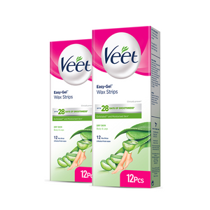 Veet Cold Wax Strips are clinically proven* to give up to 28 days of smoothness* & leave your skin exfoliated** and moisturised*. The variant for Dry Skin is Specially formulated with Aloe Vera, known for its moisturizing properties, to suit dry skin and fragranced with Green Tea. The gel formula with Easy-Gel™: • Flows around and actively grips the shortest hairs***, not the skin. • Removes the hairs from the root, for up to 28 days of smoothness*. So it gives confidence to achieve great 1st time results, even for those inexperienced with wax strips. Enjoy the pleasant gel texture on the skin, pleasant fragrance and beautiful colour.