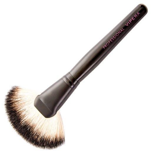 A FAN POWDER BRUSH made of goat hair, shaped into a rounded, full fan is perfect for loose and pressed products. The shape helps to spread product evenly and smoothly over face. It is also great to gently sweep neck and shoulders for smooth and soft powder application in a few strokes.