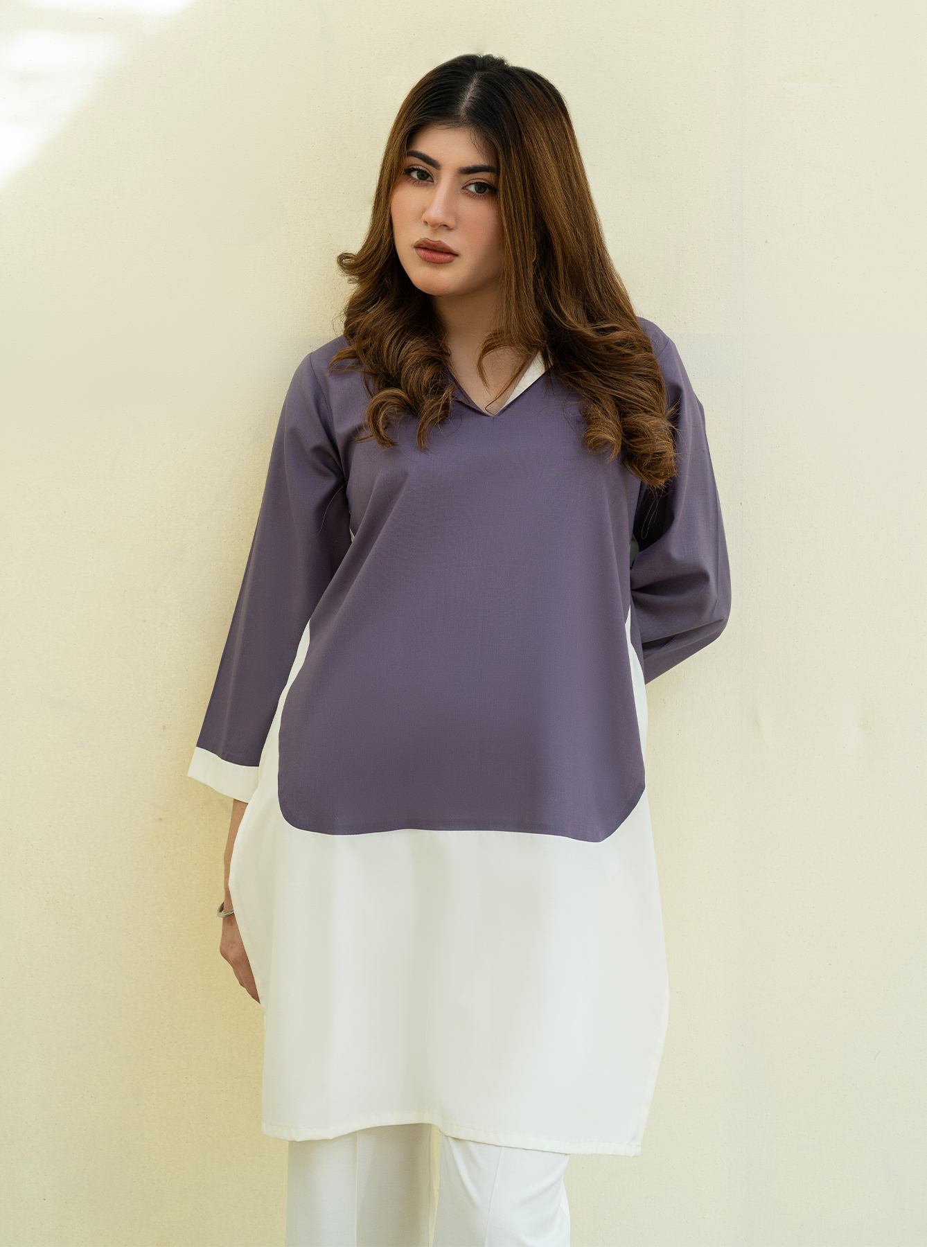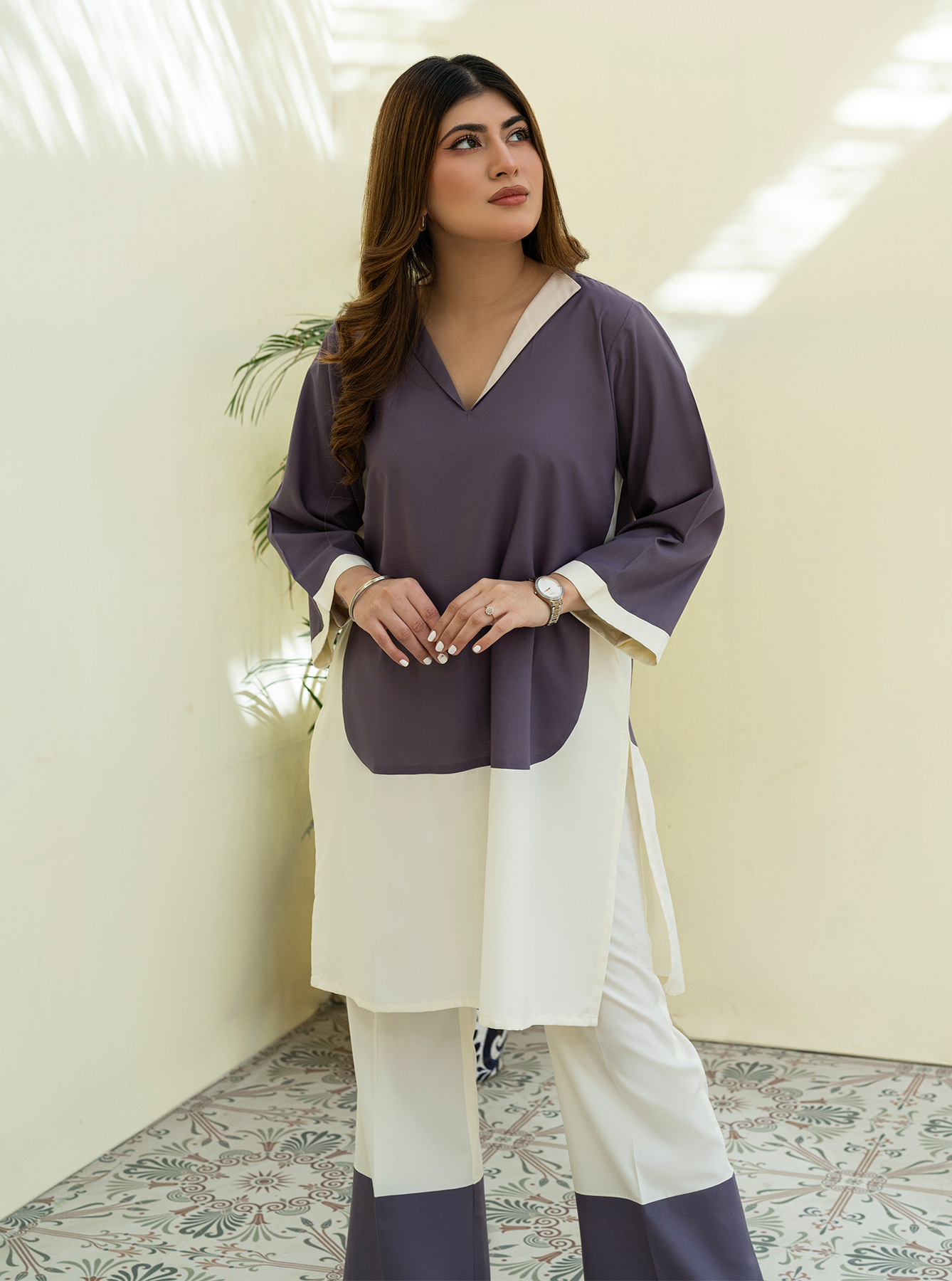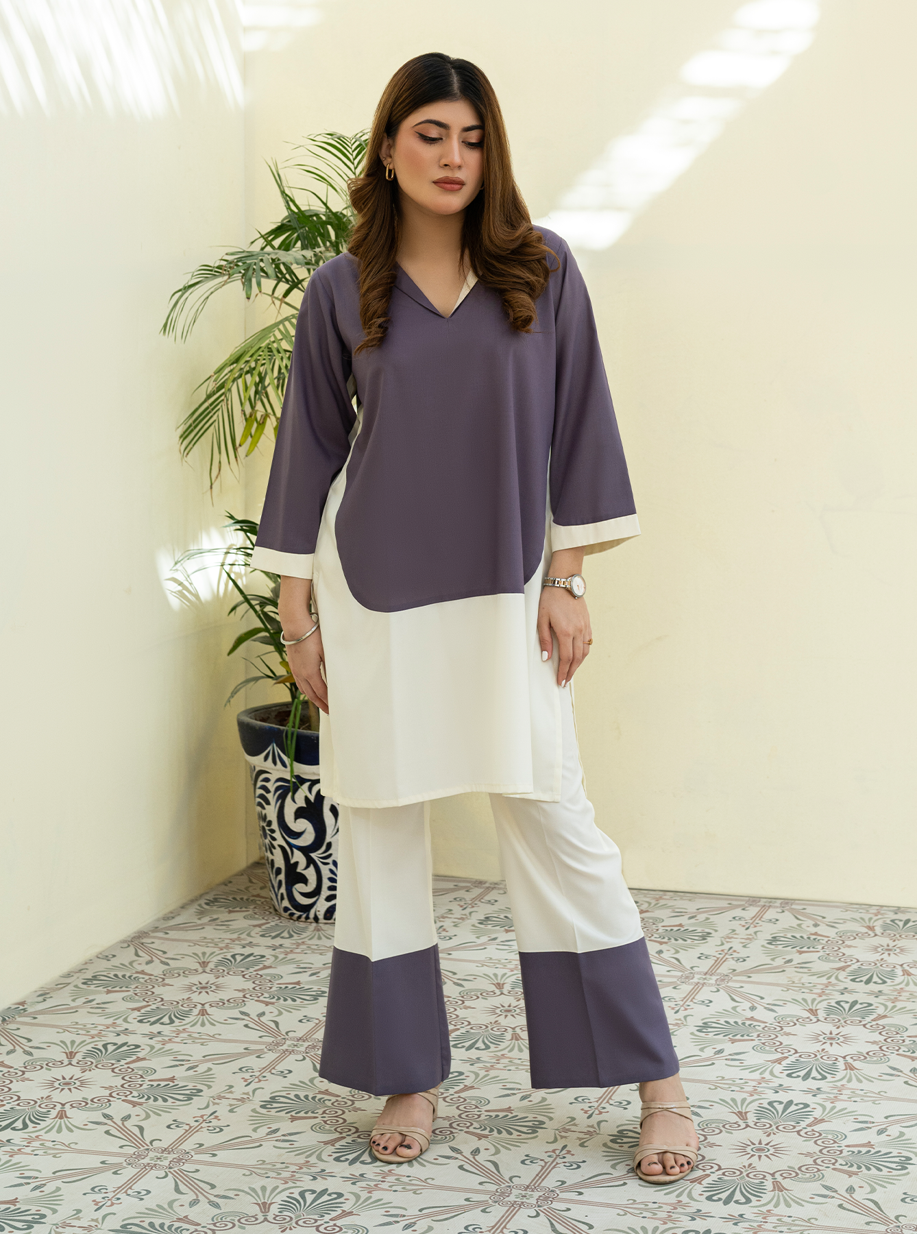 Break fashion norms with this bold, trendsetting outfit. Featuring a seamless contrast shirt with complementary shades, striking white stitch detail, and statement sleeves paired with sleek pant, it?s the perfect blend of modern flair and effortless elegance.