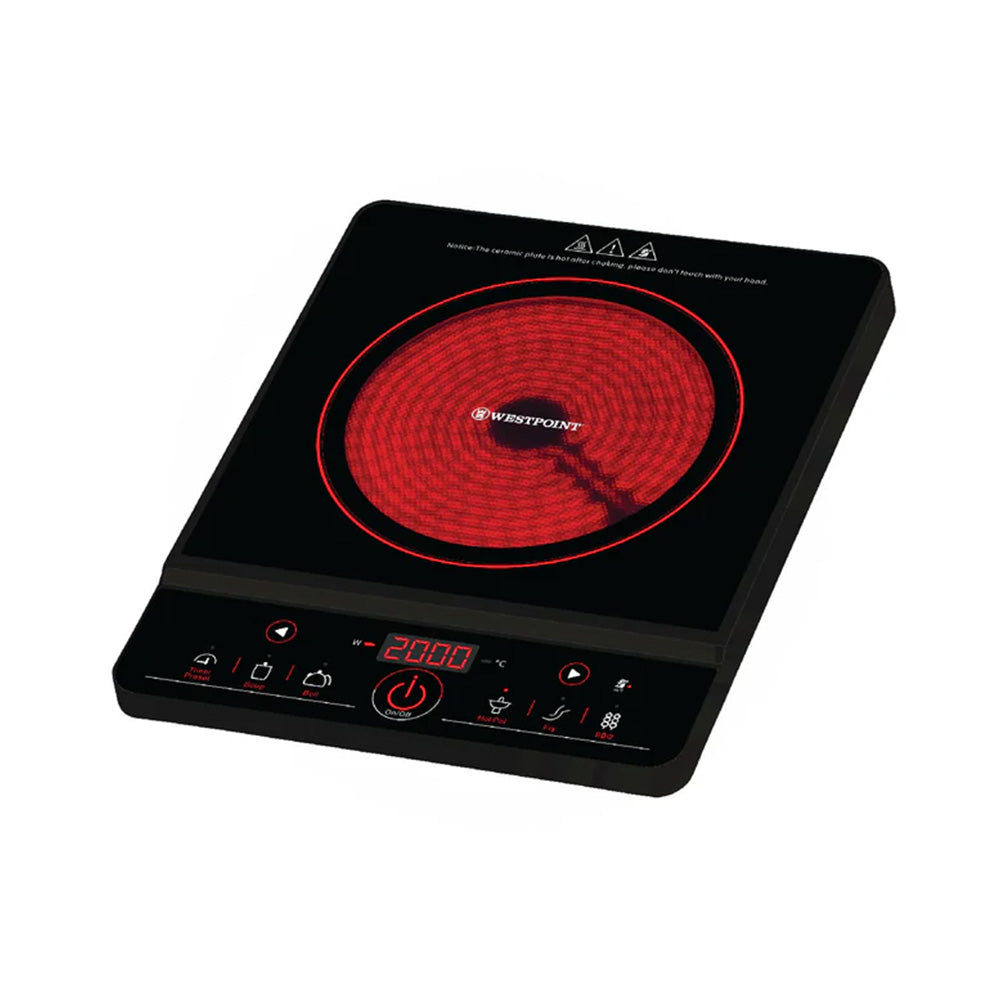 The WESTPOINT Ceramic Cooker WF-142 features an infrared ceramic cooktop with four independent heating zones for rapid, precise cooking. Its touch-sensitive interface offers nine power levels and auto shut-off timer. Safety features include residual heat indicators and a child-lock function.