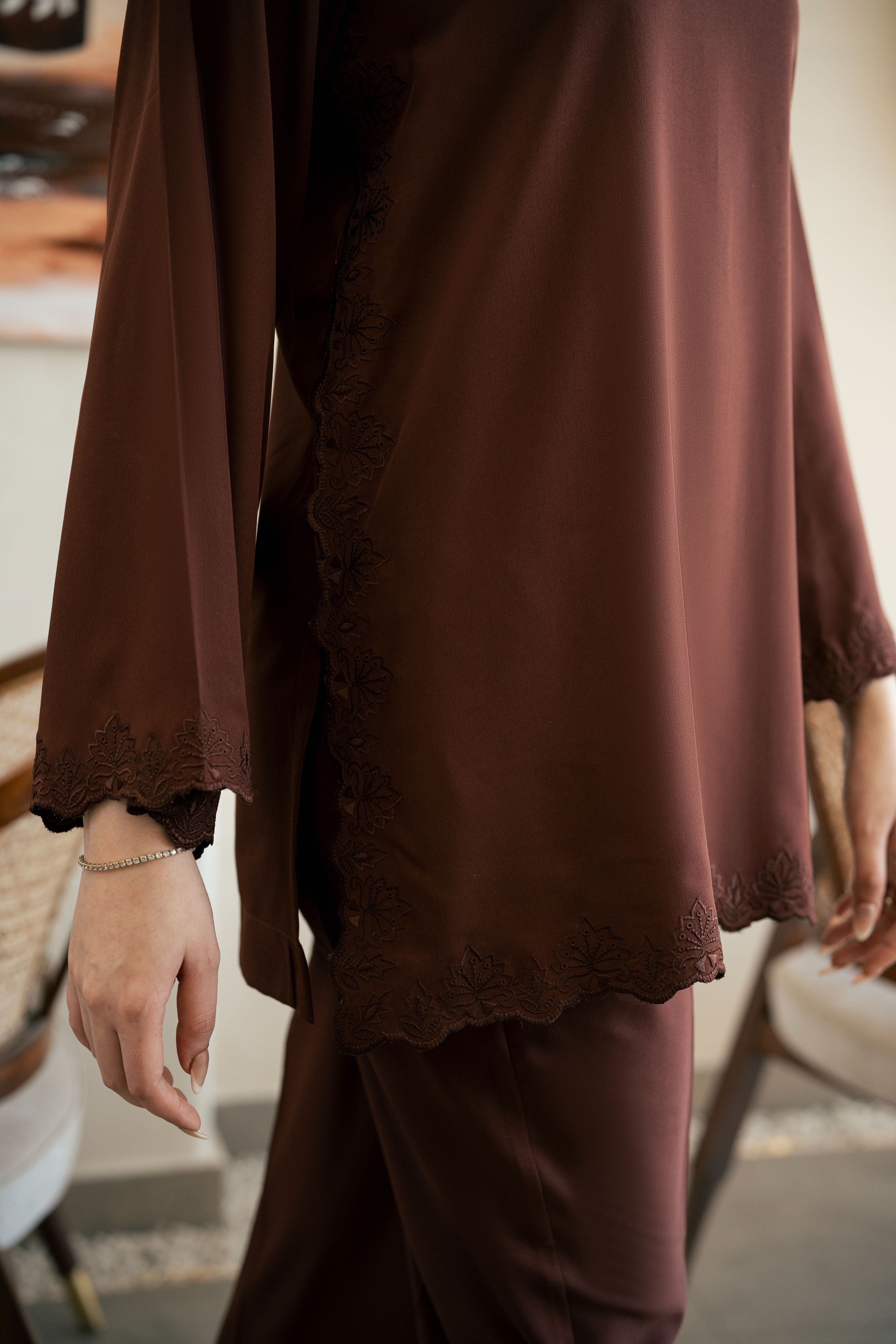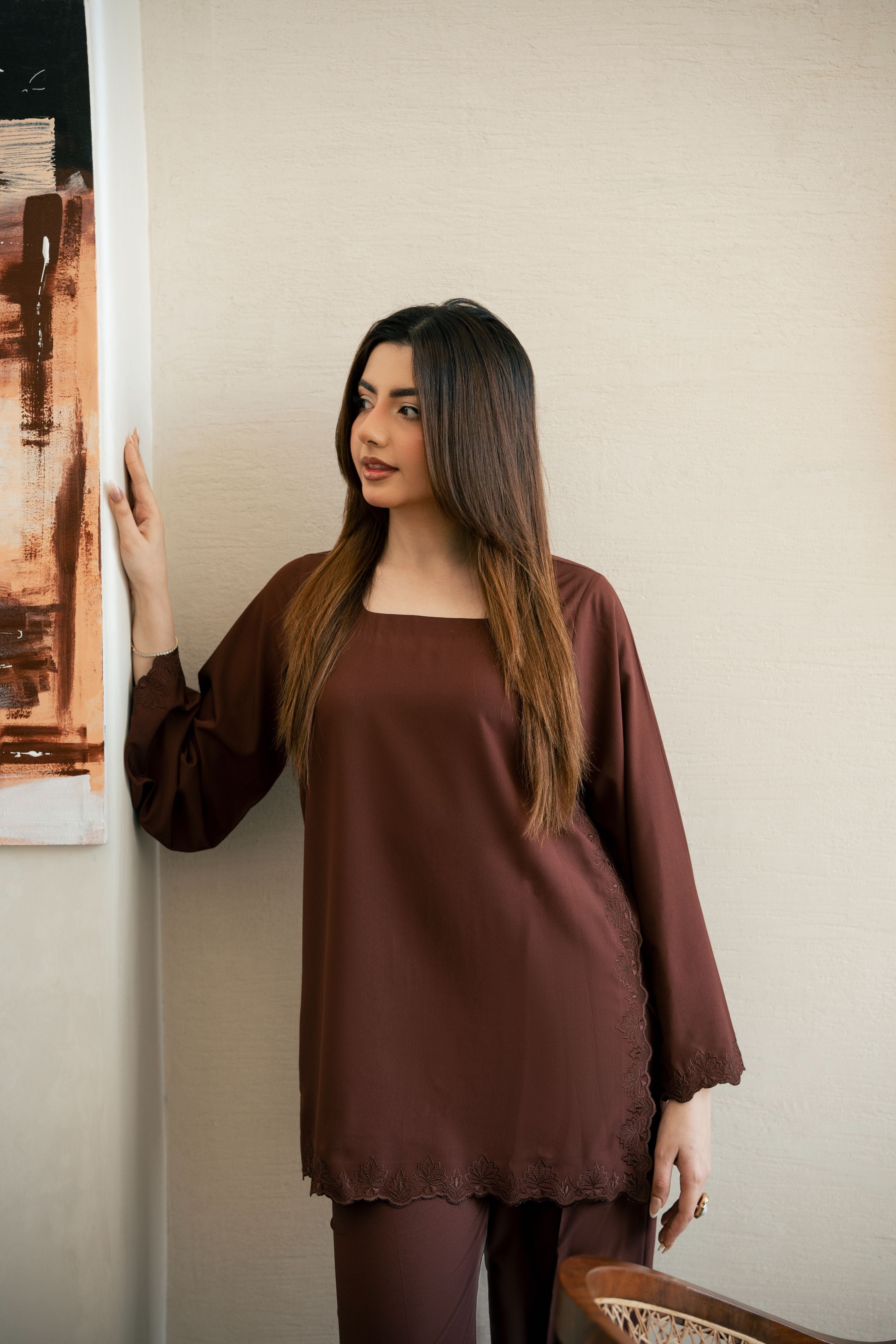 Wrapped in a warm cocoa brown, this look is all about effortless ease. The kurta keeps a relaxed flow, finished with soft lace edging that adds a quiet hint of detail. Paired with matching trousers, the set feels calm, confident, and easy to wear, simple, grounded, and naturally stylish.